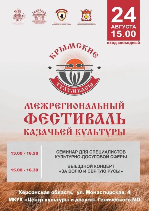 24 августа15.00Генический центр культуры и досуга В концертной программе «За волю и святую Русь!» примут участие музыкальные коллективы из Краснодарского края, Донецкой Народной Республики, Курской области и Республики Крым.Ждём именно тебя! Будет...