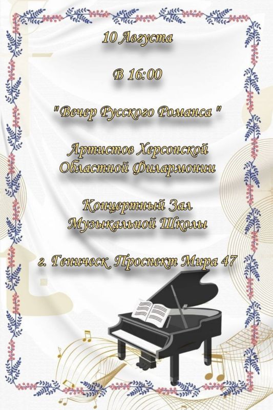 В Геническе пройдет «Вечер Русского Романса»10 августа в 16:00 состоится концерт при поддержке Министерства культуры Херсонской области.Херсонская областная филармония приглашает окунуться в этот удивительный творческий вечер!Романс — это один из самых...