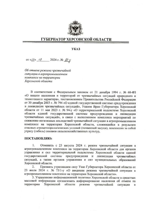 Отмена чрезвычайной ситуации в АПКРежим ЧС в агропромышленном комплексе отменен с 23 августаУказом Губернатора Херсонской области "Об отмене режима чрезвычайной ситуации в агропромышленном комплексе на территории Херсонской области" от...