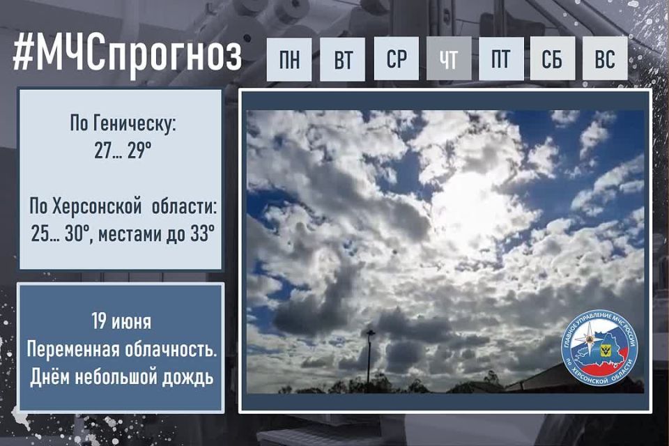 переменная облачность. Ночью без существенных осадков, днём в отдельных районах небольшой дождь. Ветер западный и северо-западный 6-11 м/с, днём местами порывы 15-18 м/с. Температура воздуха ночью 16...21°; днём 25...30°, местами до 33°. Местами в западных районах высокая пожароопасность (4 класс).