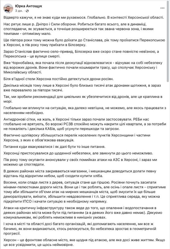 «Вопрос куда эвакуироваться и как дальше быть — это другой вопрос. Херсонцы приспособились к ежедневной опасности, но привыкнуть к этому невозможно... В динамике, наблюдая, как сдвигается, а точнее расширяется так называемая красная зона, и какими темпами — оптимизма мало», — пишет Антощук, признавая безнадёжность ситуации.