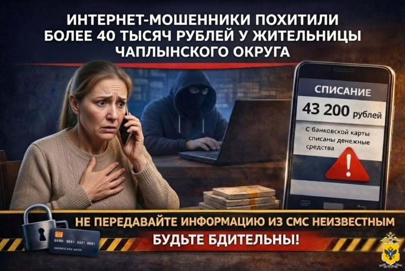 В дежурную часть Отделения МВД России «Чаплынское» с заявлением о хищении денежных средств обратилась 46-летняя жительница пгт. Чаплынка. Женщина сообщила, что неизвестное лицо похитило с её банковской карты 43 200 рублей.