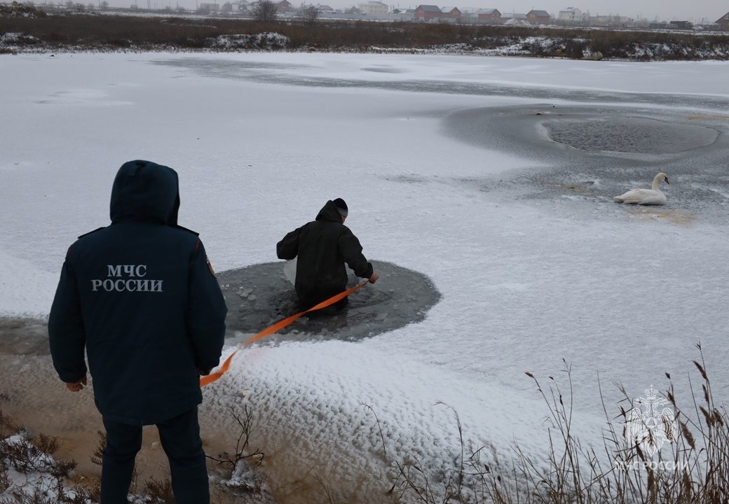 На место происшествия выехали сотрудники МЧС России. Под их наблюдением неравнодушный житель села Геническая Горка разбивал лед вокруг лап птицы, постепенно освобождая ее.