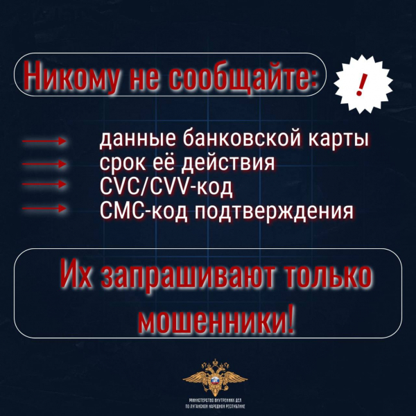 Уважаемые граждане! ГУ МВД России по Херсонской области напоминает, что работники банков не звонят гражданам с просьбами назвать персональные данные, реквизиты банковских карт и коды из смс-сообщений. Если вам поступил такой звонок — это мошенники!