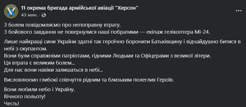 В заявлении 11-й отдельной бригады армейской авиации "Херсон" говорится, что машина была потеряна "при выполнении боевой задачи". Экипаж — 200.