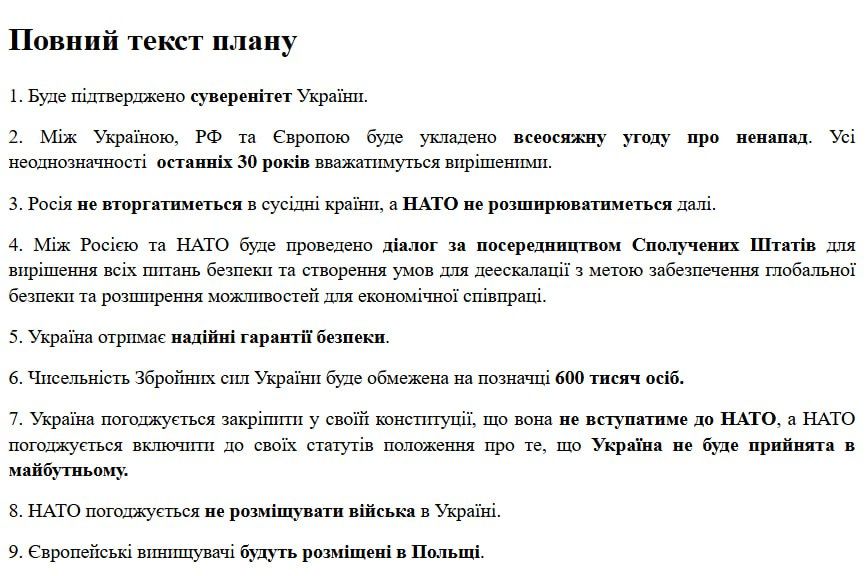 Документ включает развернутый набор политических, военных, территориальных, гуманитарных и юридических положений, по которым сторонам предлагается закрепить долгосрочную архитектуру...