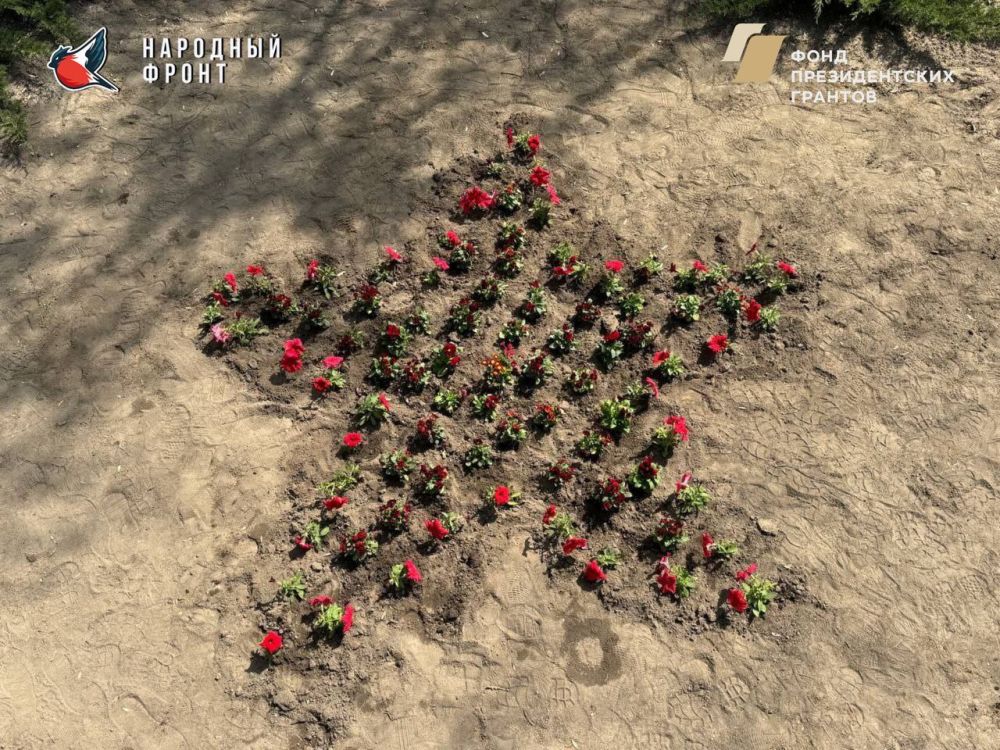 Добровольцы Приморской школы совместно с преподавателями высадили цветы в виде «Красной звезды Победы». Красная пятиконечная звезда олицетворяет героизм и мужество русского народа, отстоявшего мир на земле.
