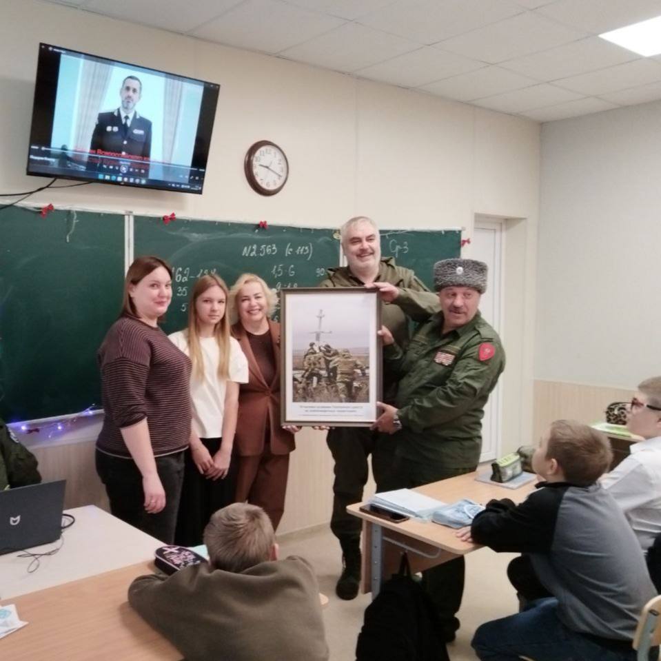 Ученикам первого в школе казачьего класса были вручены флаг Всероссийского казачьего войска и особая фотохудожественная картина, созданная по реальным событиям с участием атамана ВсКО. Ценность картины подчёркнута дарственной надписью, которую лично накануне оставил на ней для школы казачий генерал Виталий Кузнецов.