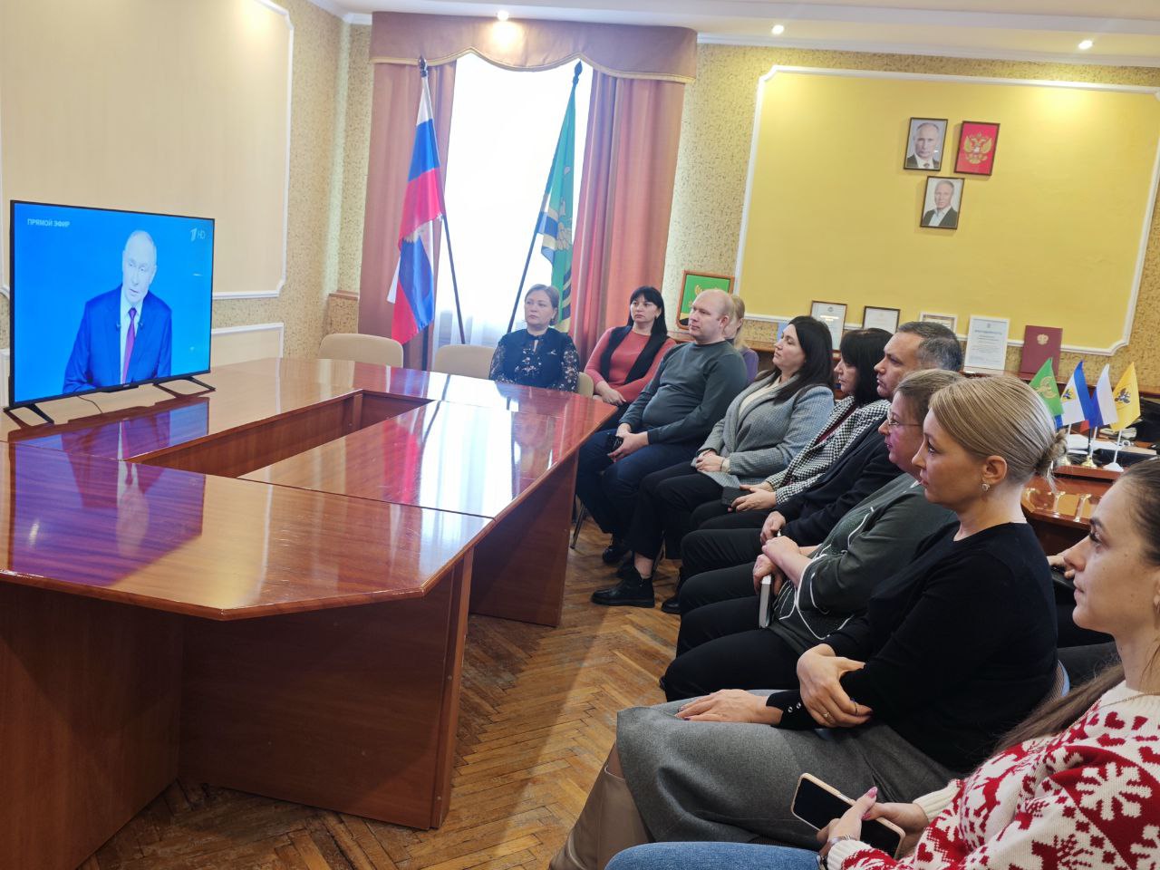 Сотрудники Администрации и Совета депутатов Новотроицкого муниципального округа смотрят прямую линию с Президентом Российской Федерации Владимиром Путиным.