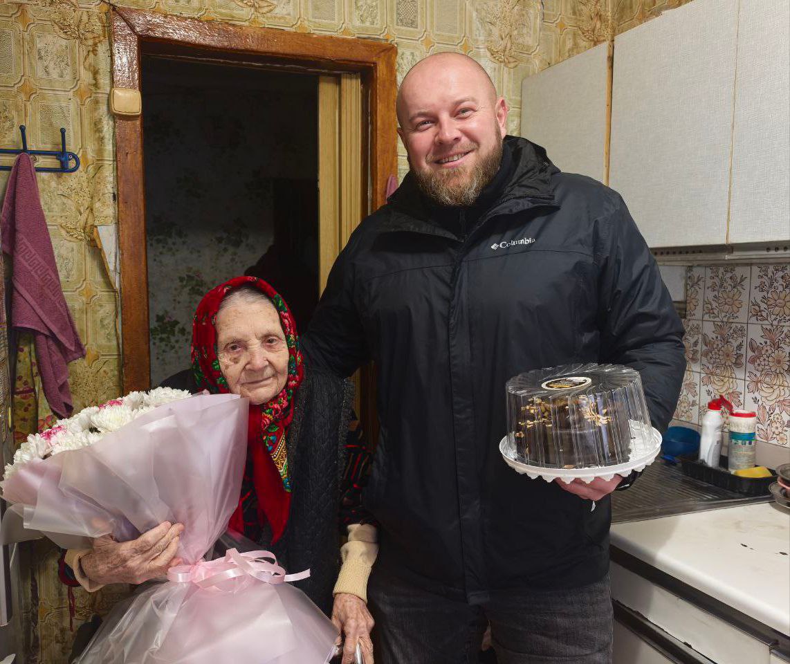 Виталий Кравченко подарил юбилярше тёплый пуховый платок, цветы и торт. Наталья Моргун также вручила ей цветы, торт и продуктовый набор. За чашкой чая они с удовольствием побеседовали, и Александра Алексеевна делилась воспоминаниями о своей жизни — это было очень ценно и интересно.