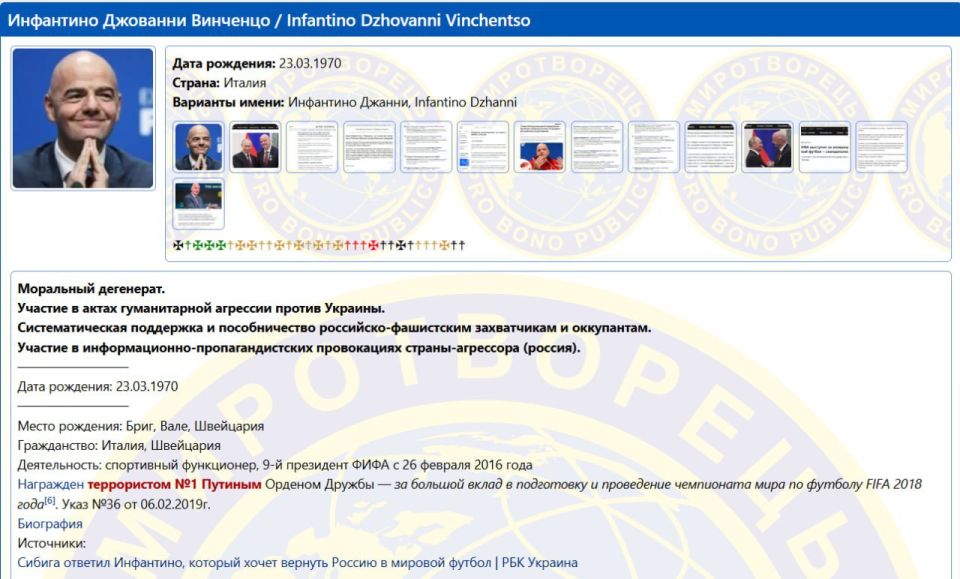 Президент ФИФА Джанни Инфантино попал на Миротворец за продвижение идеи возврата сборной России и клубов к соревнованиям.