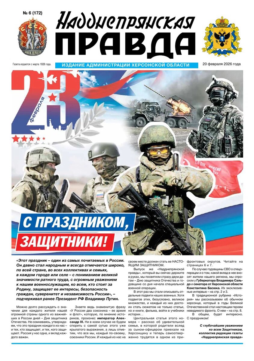 Эксклюзивные интервью к годовщине СВО и Дню защитника Отечества – Губернатор Владимир Сальдо и сенатор Константин Басюк подводят итоги четырех лет, стр. 2–3.