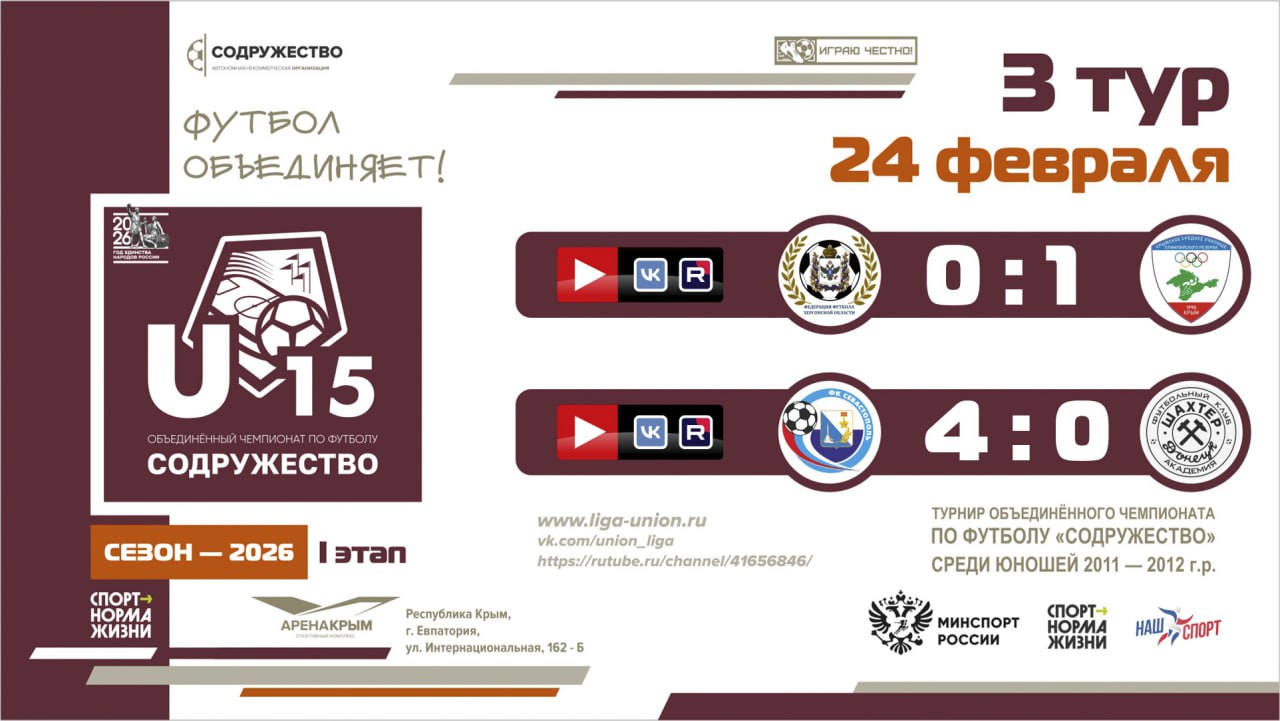 24 февраля 2026 года в г. Евпатория состоялись матчи 3 тура I этапа турнира Объединённого чемпионата по футболу «Содружество» среди юношей 2011-2012 годов рождения (U-15).