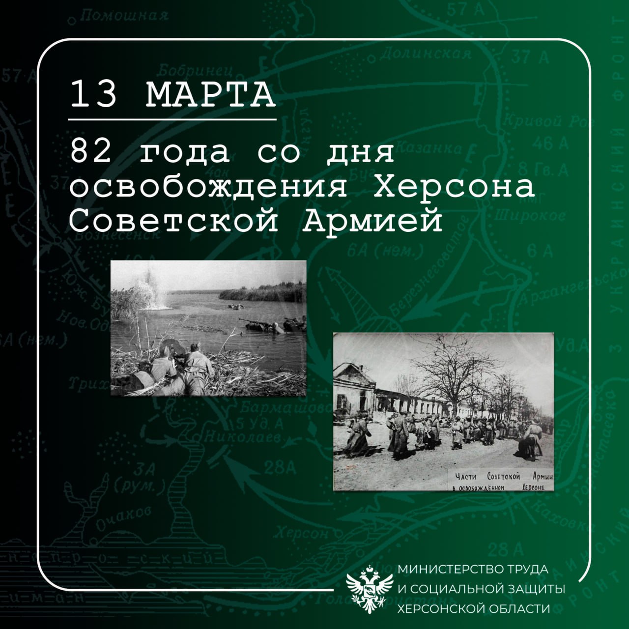 Сегодня, 13 марта, в 22 часа столица нашей Родины Москва от имени Родины салютует доблестным войскам 3-го Украинского фронта, овладевшим городами Херсон и Берислав, двадцатью артиллерийскими залпами из 224 орудий».
