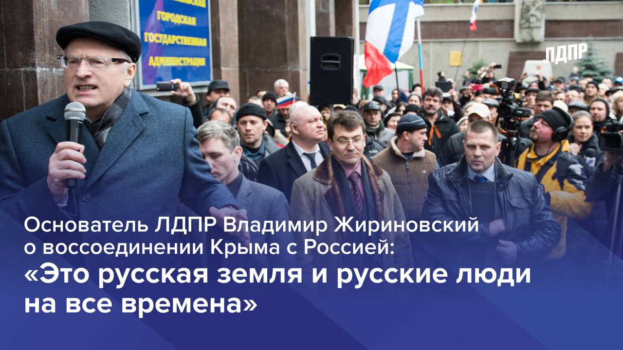 Основатель ЛДПР Владимир Вольфович Жириновский всегда предвидел этот путь. Он говорил: «Это русская земля и русские люди на все времена». Его слова оказались пророческими. Сегодня мы - Крым, Севастополь, Херсонская и Запорожская области, Донецкая и Луганская республики - стоим плечом к плечу в одной большой и сильной семьей!