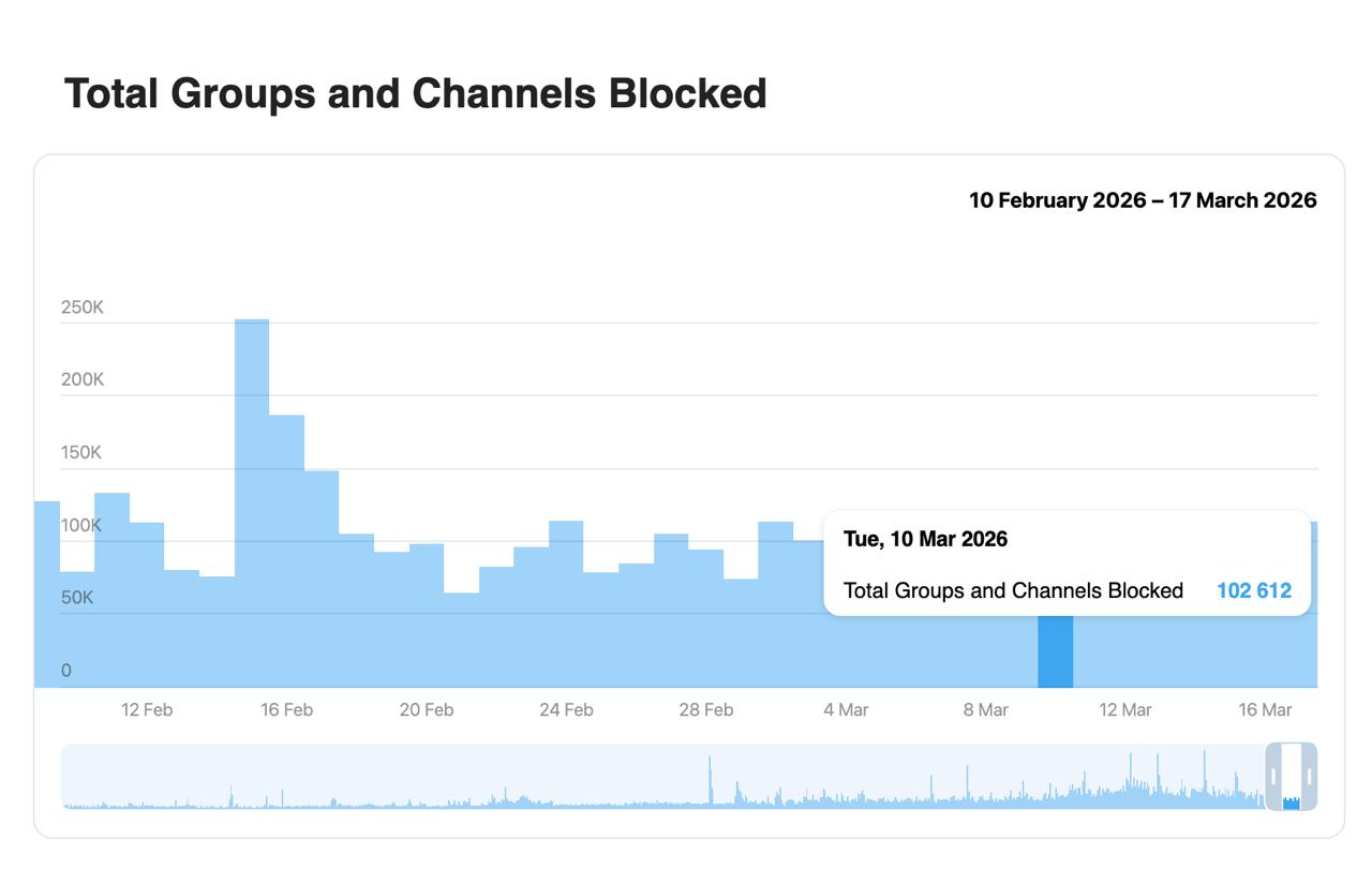 Telegram за неделю заблокировал свыше 752 тыс. каналов и групп, подсчитал RT.