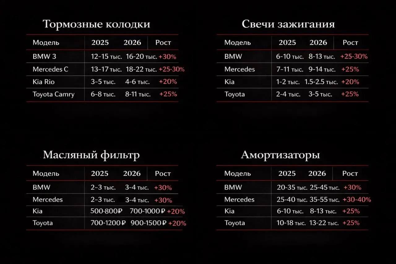 К 2026 году базовые автозапчасти выросли в цене на 20–40%: влияет сложная логистика, налоги и дефицит оригинальных деталей.