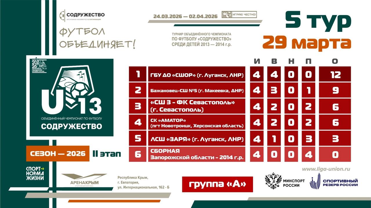 Турнирная таблица после 5 тура II этапа турнира Объединённого чемпионата по футболу «Содружество» среди детей 2013-2014 годов рождения (U13)