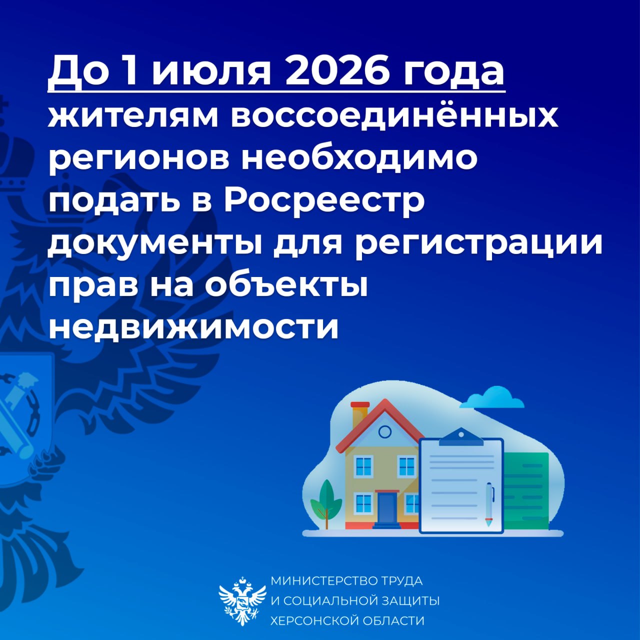 Регистрация недвижимости в воссоединенных регионах (Донецкой Народной Республики, Луганской Народной Республики, Херсонской и Запорожской областях) происходит в соответствии с законодательством Российской Федерации. Граждане, владеющие объектами недвижимости на этих территориях, должны зарегистрировать ранее возникшее право собственности. Для этого до 1 июля 2026 года необходимо подать в Росреестр заявление и пакет документов, подтверждающих право собственности.