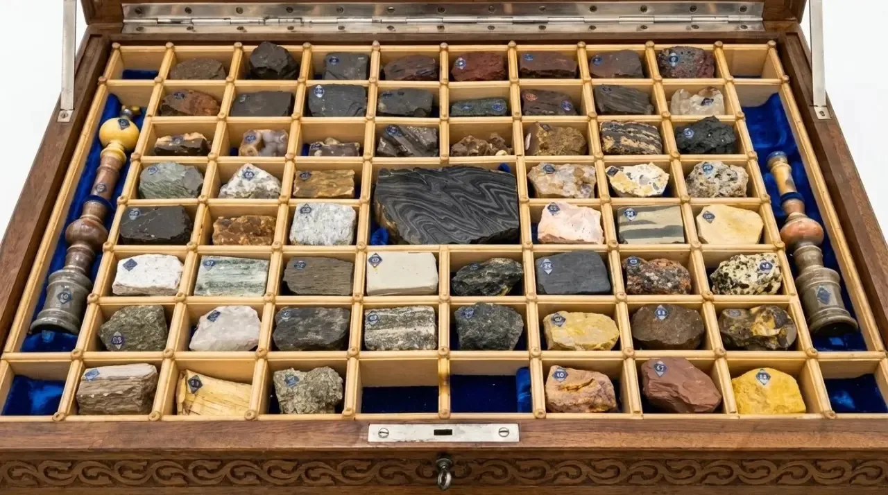 В коллекции - глинястый сланец, тальковый сланец, горный хрусталь и еще 61 образец пород, руд и минералов, а также два стеклянных флакона с порошками.