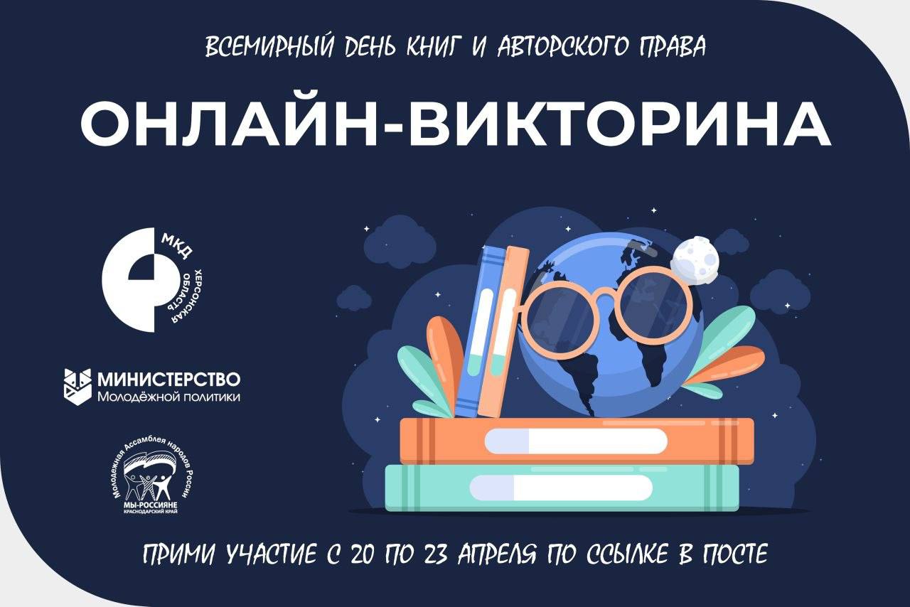 Дорогие друзья! Предлагаем вам проверить свои знания и присоединиться к увлекательной онлайн-викторине, посвящённой Всемирному дню книг и авторского права. Мероприятие пройдёт в дистанционном формате с 20 по 23 апреля 2026 года.