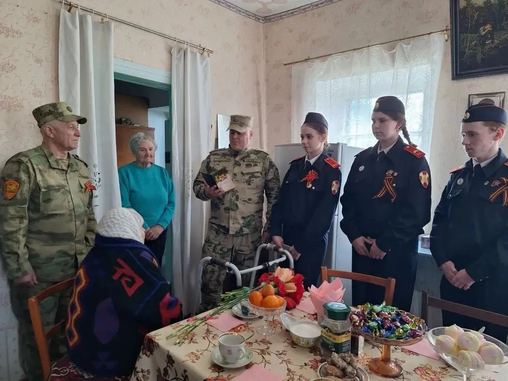 В эти трогательные майские дни наши сердечные поздравления принимают те, кто помнит войну не по учебникам. Сегодня делегация в составе сотрудников Росгвардии, полиции и юных волонтеров посетили Ольгу Николаевну — самую старшую жительницу поселения.
