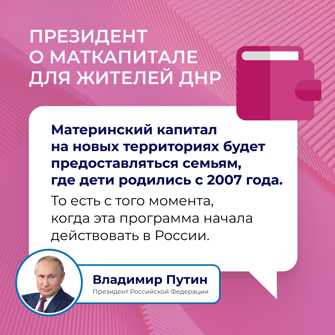 «С 1 февраля материнский капитал в России вновь проиндексирован, как мы и говорили, на величину фактической инфляции за прошлый год. То есть на 11,9%. Право на такую меру поддержки теперь есть и у граждан России — жителей новых субъектов Федерации. Предлагаю предоставлять материнский капитал в Донецкой и Луганской народных республиках, Запорожской и Херсонской областях семьям, в которых дети родились начиная с 2007 года. То есть с того момента, как эта программа начала действовать по всей России», — сказал Президент.
