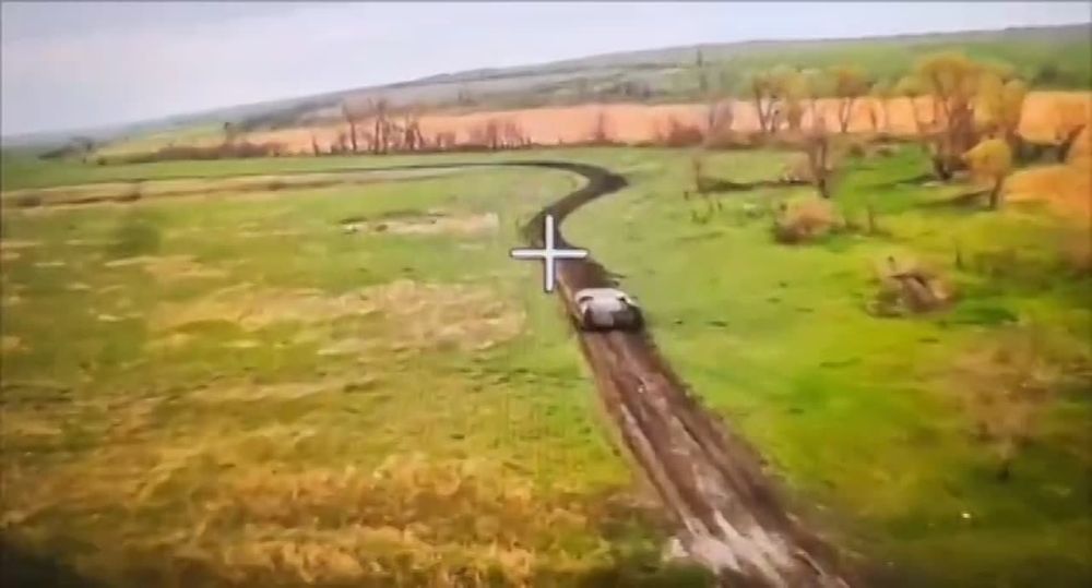 Поражение вражеской техники дроном на оптоволокне на одном из направлений линии фронта. Видео в 2-х ракурсах.