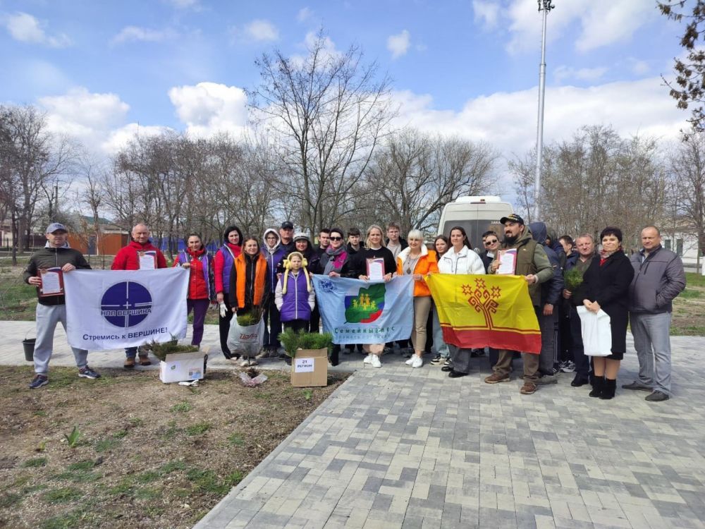 Студенты Генического медколледжа, активисты из Чувашии и местные власти, включая главу муниципалитета Юлию Семякину, посадили саженцы сосны, берёзы и кедра.