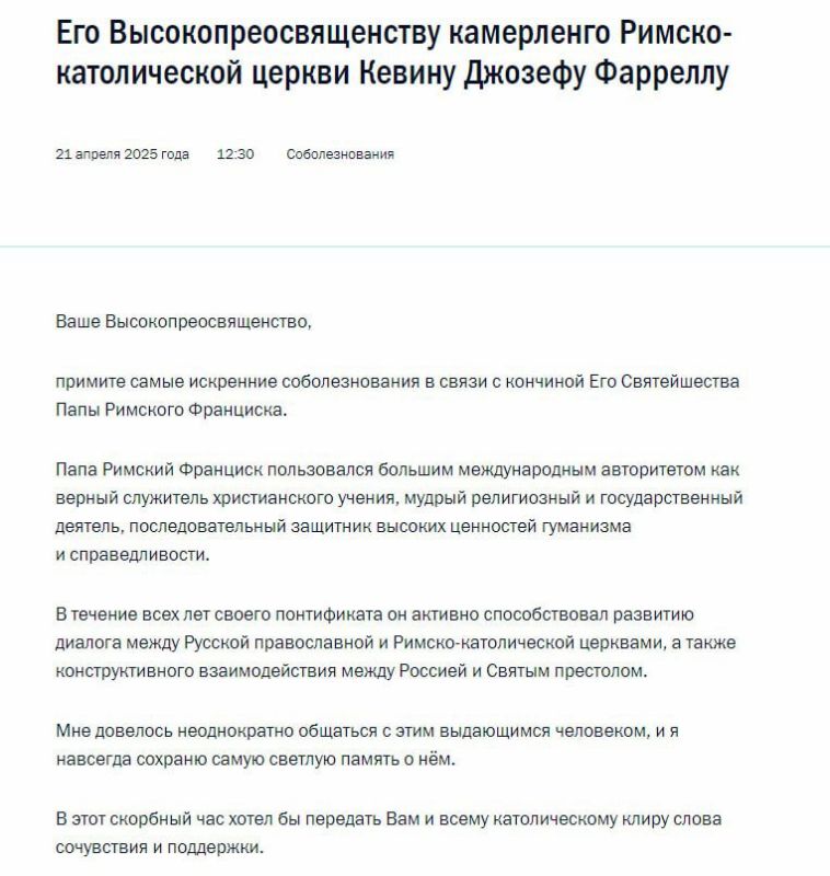 "Папа Римский Франциск пользовался большим международным авторитетом как верный служитель христианского учения, мудрый религиозный и государственный деятель, последовательный защитник высоких ценностей гуманизма и справедливости", — сказано в телеграмме.