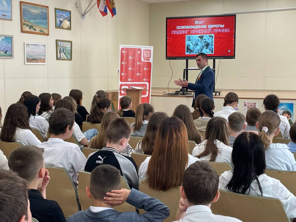 Лектором выступил Министр культуры Херсонской области Артем Лагойский, который рассказал школьникам о вкладе Красной Армии в победу над нацистской Германией.