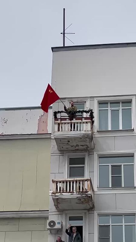 Сцену с флагом СССР при взятии Берлина воссоздали в Хабаровске. Житель города, одетый в советскую форму, вышел на балкон и размахивал красным стягом.