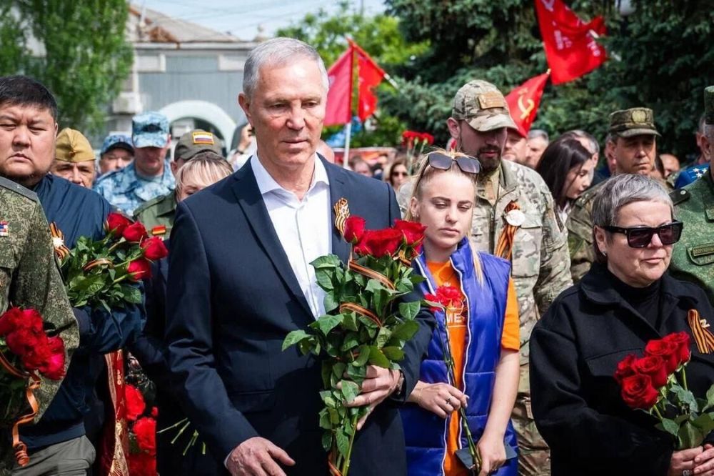 После непродолжительного митинга в честь 80-летия Победы в Великой Отечественной войне глава области, члены правительства и парламента Херсонской области, а так же все собравшиеся возложили цветы к монументу Скорбящая Мать.