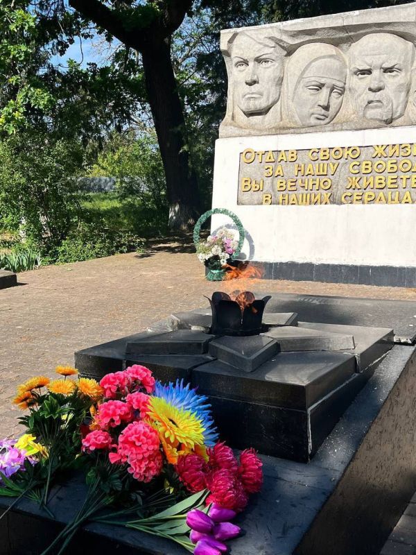 Жители, не унывая, украсили улицы флагами и несут букеты к монументам.