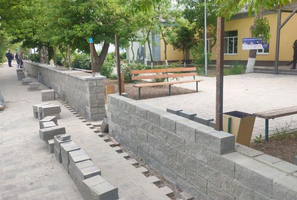 Второй этап капитального ремонта школы № 4 в городе Геническ набирает темп, обещая вскоре подарить городу обновлённое, современное образовательное пространство. В настоящее время подрядчик активно занимается установкой забора из каменных блоков «Француз» с декоративным бетонным покрытием.