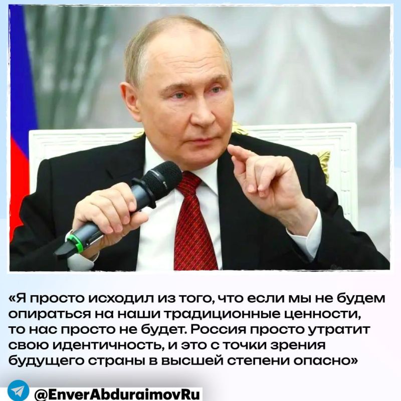 Президент Владимир Путин в интервью программе «Москва. Кремль. Путин» отметил, что опора на традиционные ценности — это жизненная необходимость для сохранения российской идентичности. Он предупредил, что без таких ориентиров Россия «просто утратит свою идентичность».