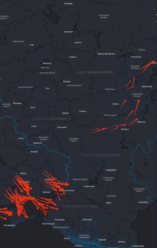 Массовая атака украинских дронов происходит прямо сейчас.