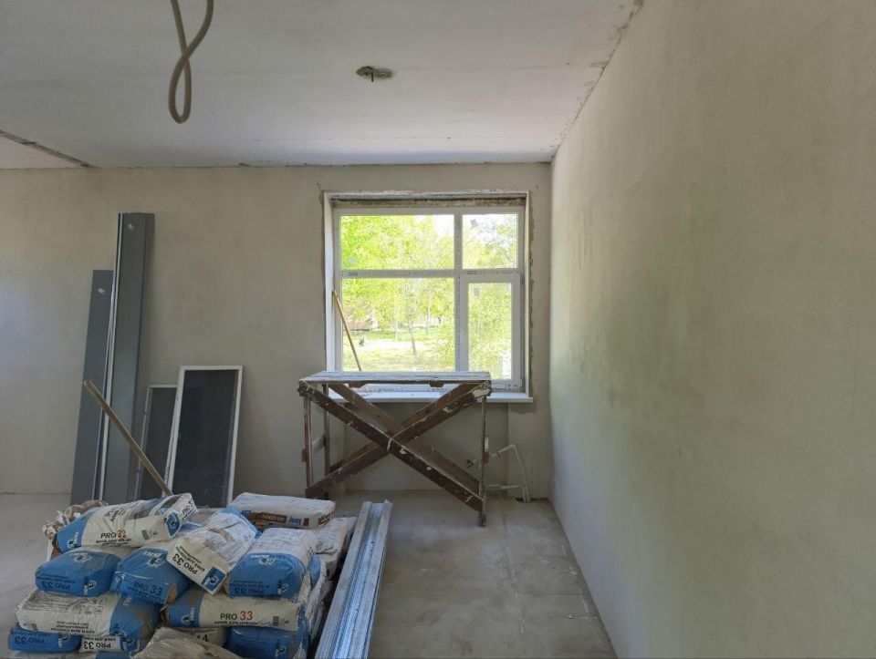 На сегодняшний день специалисты уже завершили демонтажные работы, установили окна и двери, уложили плитку. В настоящее время проводятся работы по ремонту внутренних помещений и входных групп: стяжка полов, чистовая штукатурка стен, монтаж потолков типа «Армстронг».
