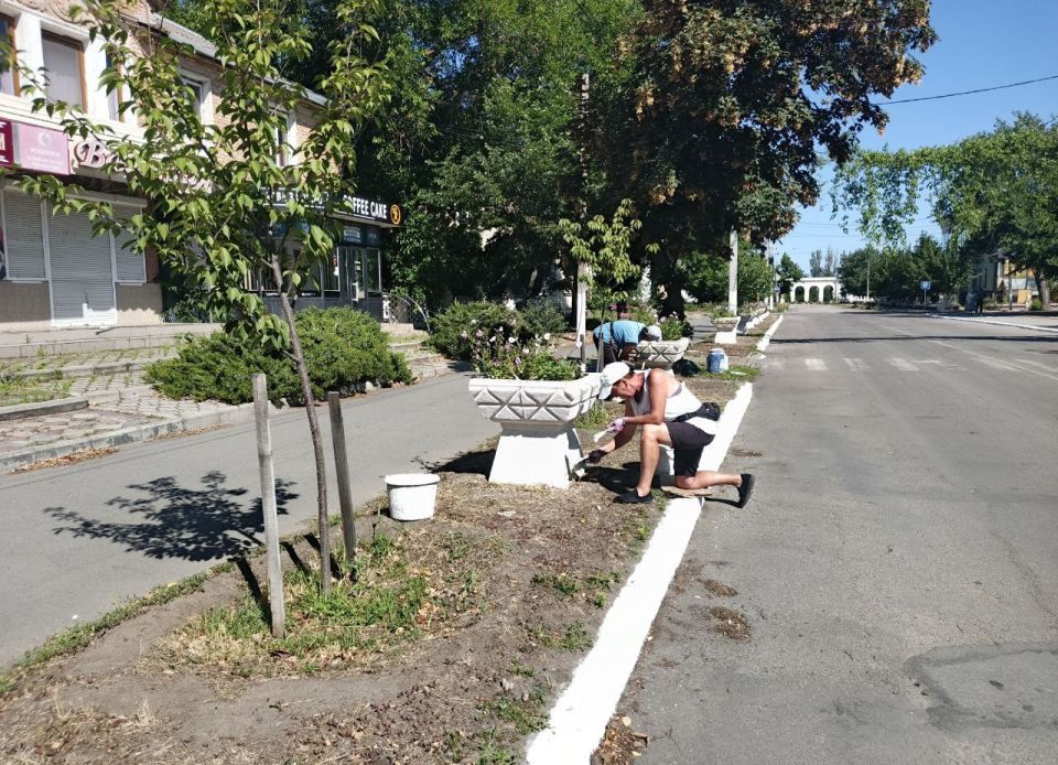 В непростое для Новой Каховки время работники коммунального хозяйства продолжают свою важную работу, бережно сохраняя деревья, кустарники и цветы Традиция – побелка бордюров и высадка петуний на центральной улице Первомайской – продолжена. Цветы украсили не только клумбы на самой улице, но и цветники вдоль дороги. Радость вызывает чудесная клумба возле памятного знака «Слава труду», где фиолетово-зеленая цветочная композиция создает неповторимое настроение даже в самый жаркий летний день Регулярный уход и полив организованы также для зеленых островков на площади возле кинотеатра «Юность» и в сквере возле памятника учителю.