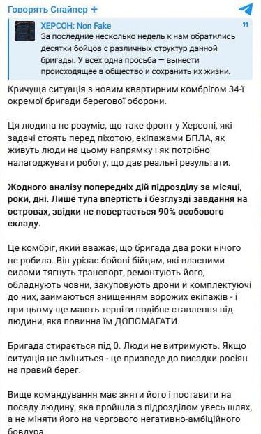 Он отмечают, что новый комбриг 34 бригады, 27-летний полковник, не понимает динамики херсонского направления и "зачем-то уничтожает все, что до него там строили годами", давая "бессмысленные задания на островах, откуда не возвращается 90% личного состава".