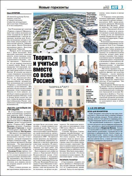 Из публикаций вы узнаете о том, как проходило одно из самых масштабных молодежных событий лета — открытие резиденции арт-кластера «Таврида» в творческом поселке «Счастливцево», о программе профориентации для активистов Движения Первых, а также сборе гуманитарной помощи жителям Каховского и Новокаховского округов.
