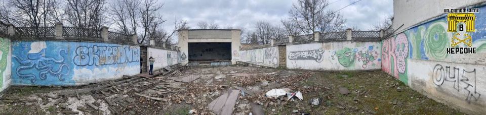 Посмотрите, какая прелесть! Это стена открытого кинотеатра в парке Шевченко в Геническе, который при оккупации украинского режима выглядел как на первом фото. Теперь тут появился красивейший мурал с матрешками.