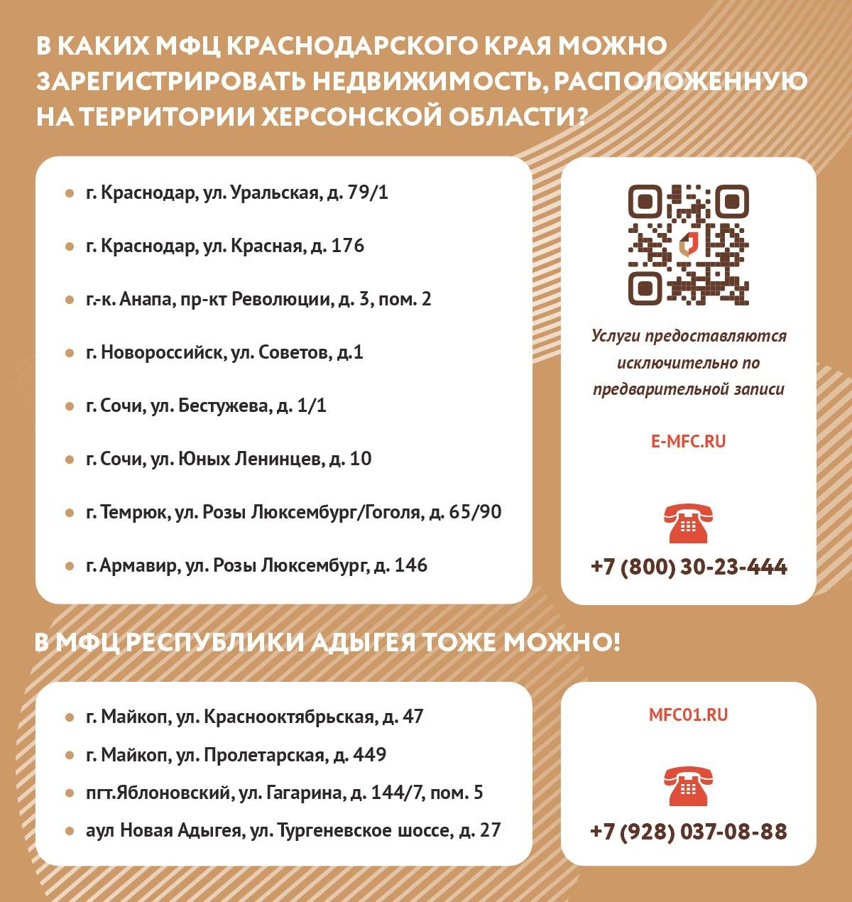Для предварительной записи воспользуйтесь сайтами МФЦ Краснодарского края (https://e-mfc.ru/), Республики Адыгея. (https://mfc01.ru/)