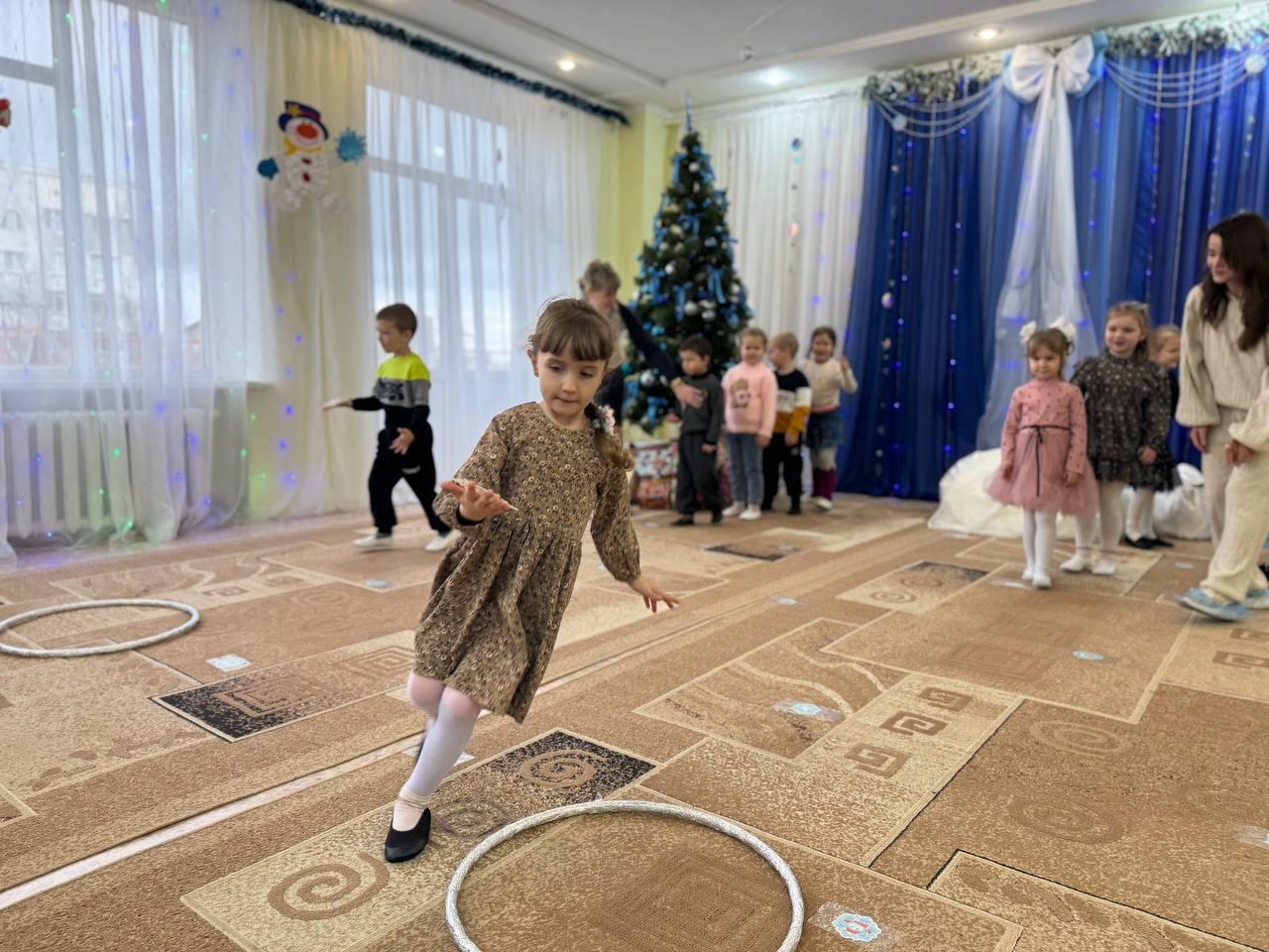 Особый восторг у малышей вызвала игра «Снежный сугроб», где под музыку все танцевали, а когда наступала тишина — дружно «прятались» под воображаемым сугробом.