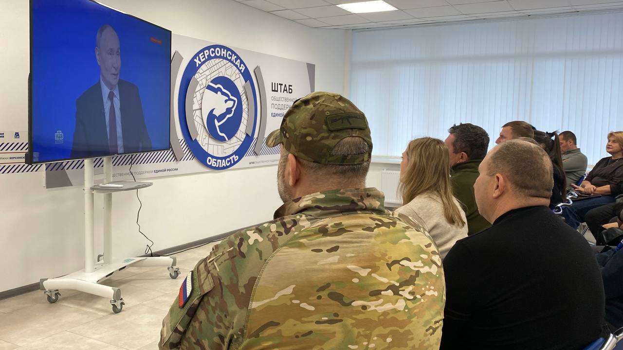 Муниципальные депутаты, глава Генического округа, секретарь местного отделения «Единой России» Юлия Семякина, а также действующие участники специальной военной операции собрались сегодня в Штабе общественной поддержки «Единой России», чтобы в прямом эфире наблюдать за «Итогами года» с Президентом Российской Федерации Владимиром Владимировичем Путиным.