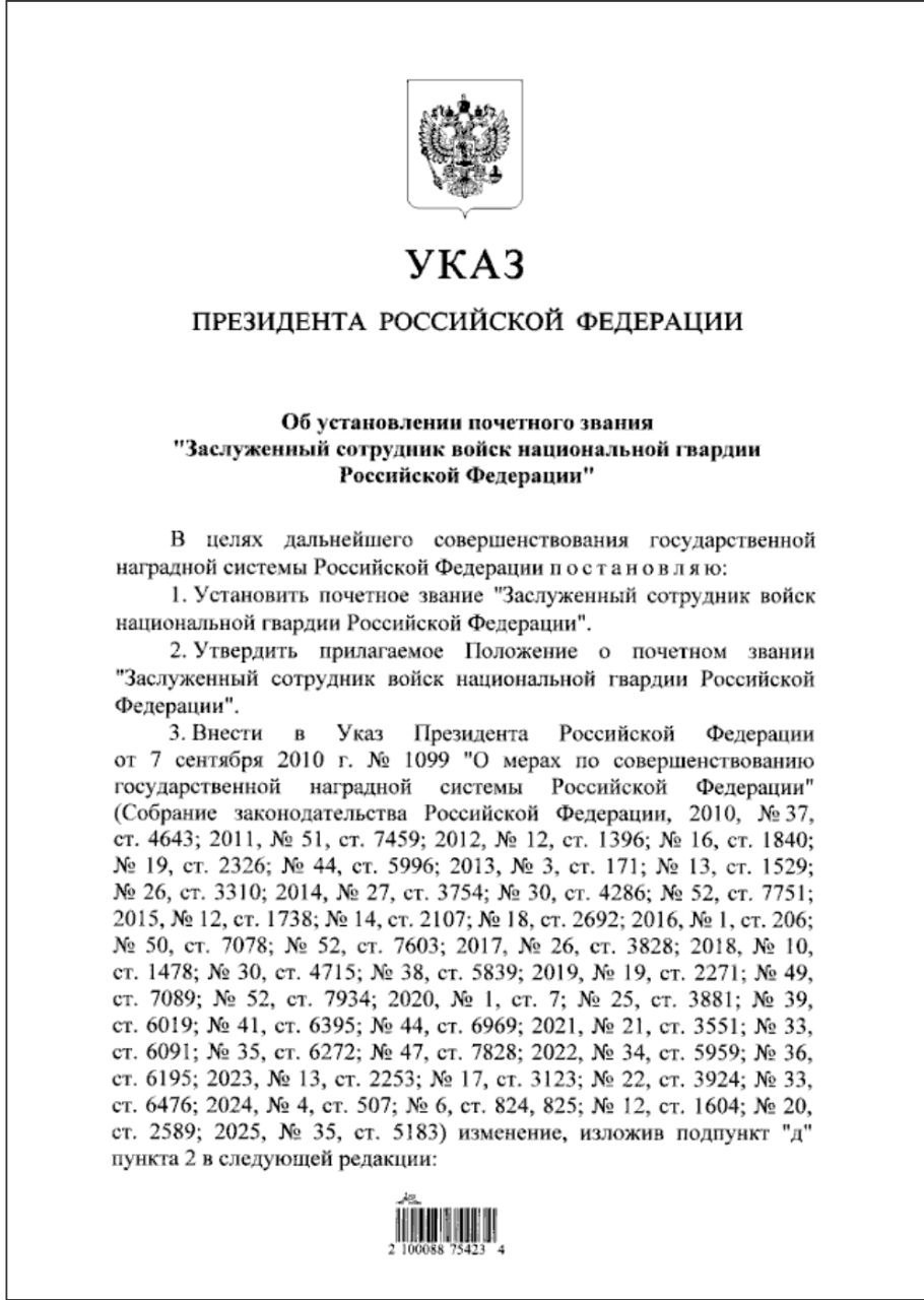 Президент России подписал указ об установлении почётного звания «Заслуженный сотрудник войск национальной гвардии Российской Федерации». Это признание особых заслуг тех, кто обеспечивает правопорядок и безопасность в стране.