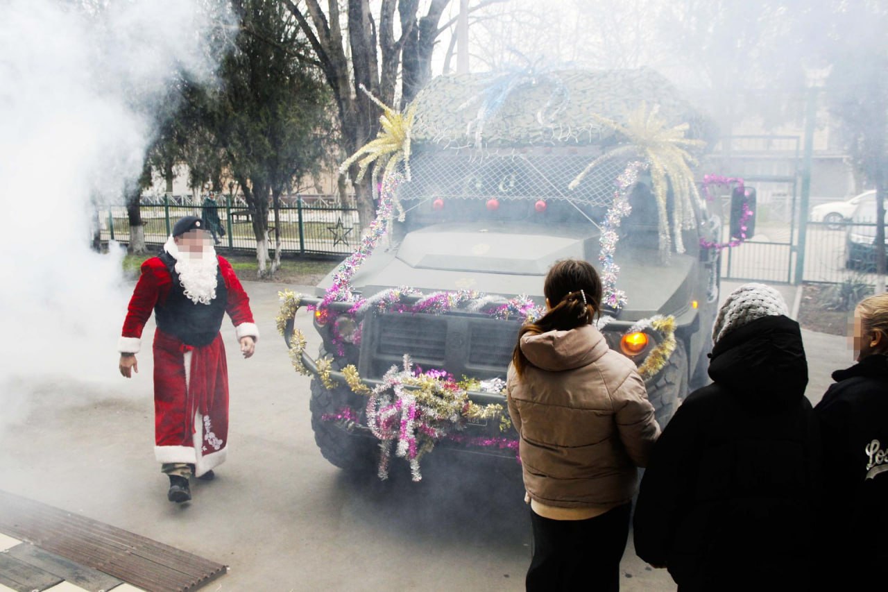 В рамках ведомственной акции «Дед Мороз специального назначения» главный волшебник ведомства прибыл к воспитанникам Генической санаторной школы-интернат на боевом автомобиле и привез сладкие подарки для праздничного стола, которые ребята доставали из военных ящиков.
