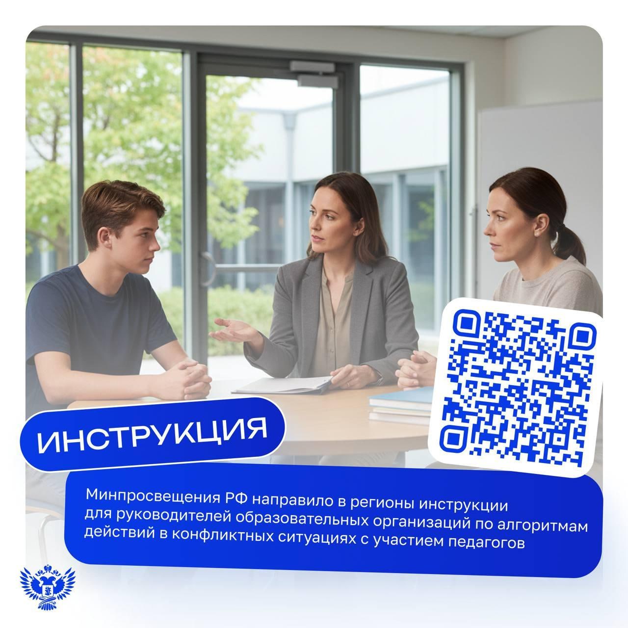 Министерство просвещения Российской Федерации (http://t.me/minprosrf) направило в регионы инструкции (https://docs.edu.gov.ru/document/ac8e1c3d8238078741df94730a94b0ca/download/7877/) для руководителей образовательных организаций по действиям в конфликтных ситуациях у педагога. Документ был одобрен на заседании Совета Минпросвещения России по защите профессиональной чести и достоинства педагогических работников.
