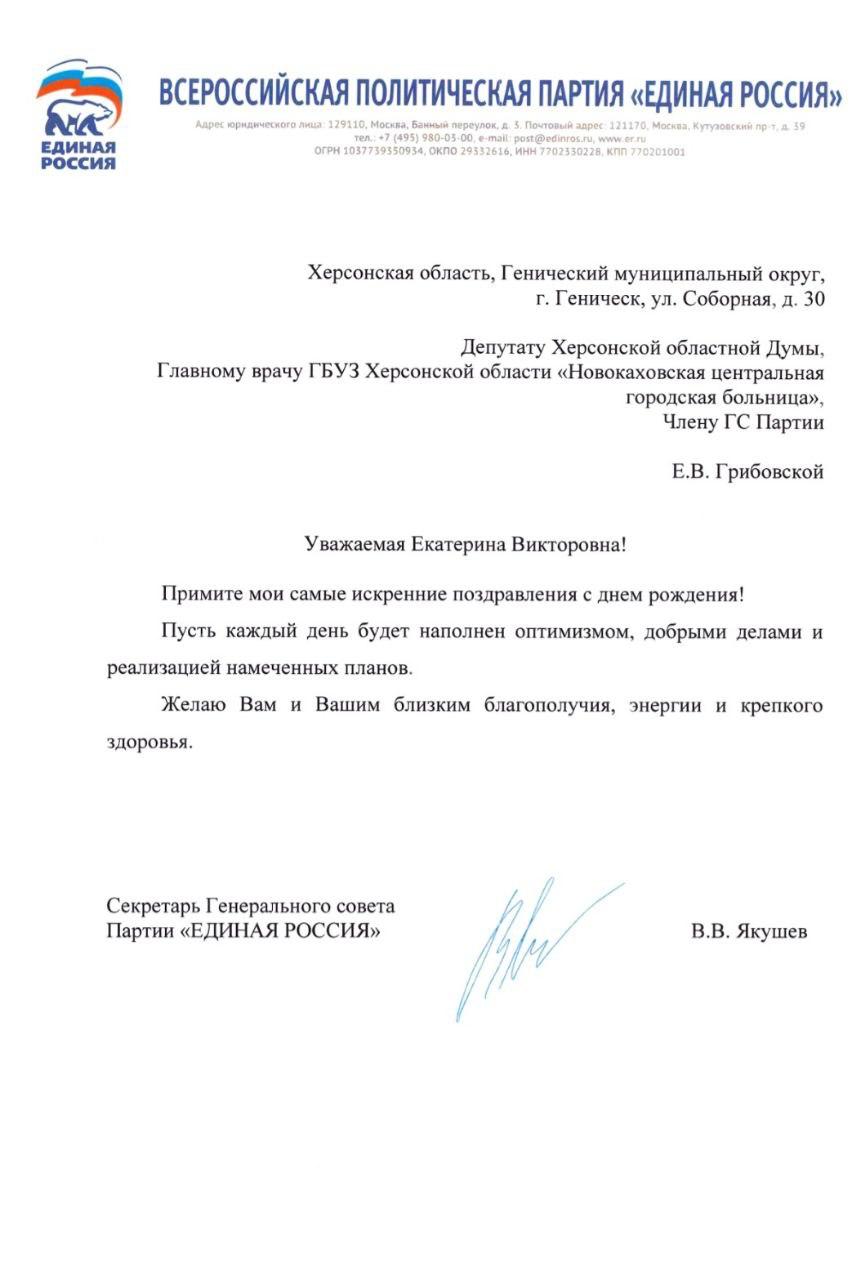 Екатерина Грибовская, совмещающая пост главного врача Новокаховской ЦГБ и депутатский мандат в Херсонской областной Думе, получила персональное поздравление от Секретаря Генсовета партии «Единая Россия» Владимира Якушева.