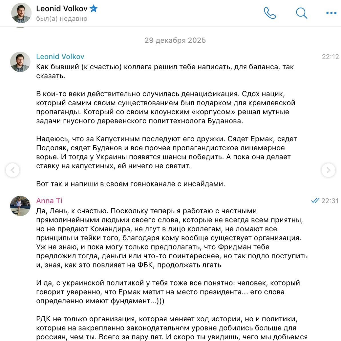 задачи гнусного деревенского политтехнолога Буданова. Надеюсь, что за Капустиным последуют его дружки. Сядет Ермак, сядет Подоляк, сядет Буданов и все прочее пропагандистское лицемерное ворье. И тогда у Украины появятся шансы победить. А пока она делает ставку на капустиных, ей ничего не светит», - написал Волков в личном сообщении бывшей коллеге.